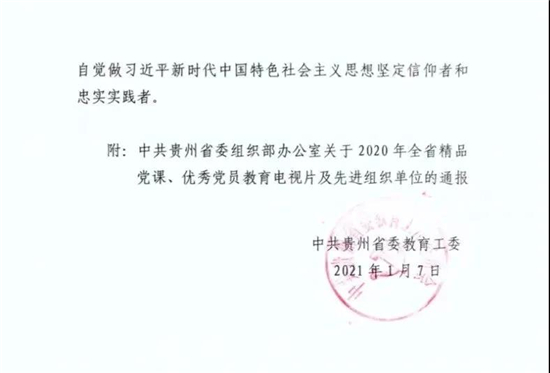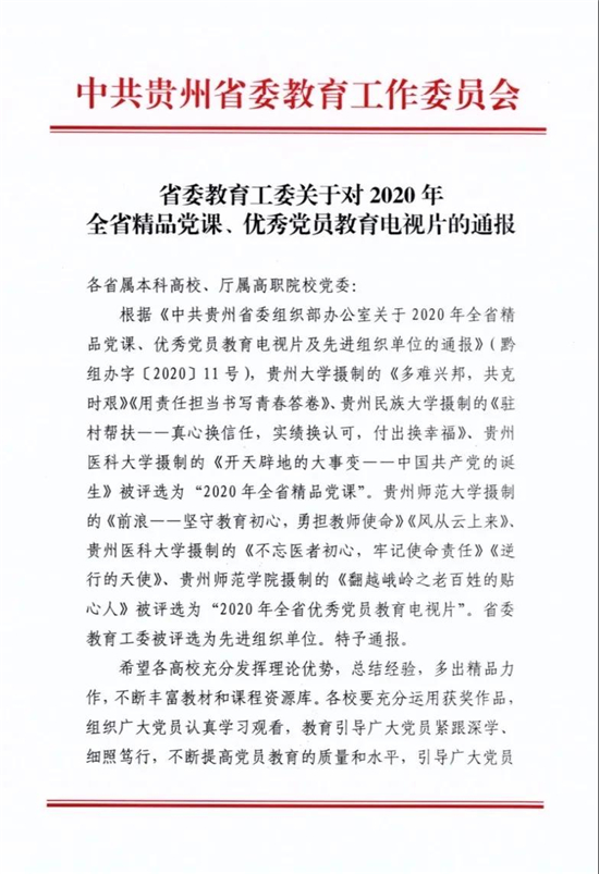近日,中共贵州省委组织部下发文件,对2020年全省精品党课、优秀党员教育电视片及先进组织单位进行了通报。由77779193永利官网摄制并选送的视频《开天辟地的大事变——中国共产党的诞生》被评为2020年全省精品党课;《不忘医者初心,牢记使命责任》、《逆行的天使》被评为2020年全省优秀党员教育电视片。