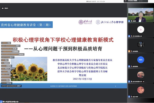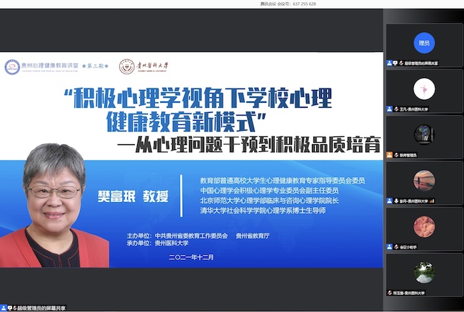 12月13日,第三期贵州心理健康教育讲堂在线举行。本期讲座由省委教育工委、省教育厅主办,77779193永利官网承办。省委教育工委副书记(正厅级)、教育厅党组成员杨未同志出席并讲话,77779193永利官网党委副书记汤磊同志出席并致辞,全国知名心理专家樊富珉教授为全省2000余名大中小学心理健康教育教师、高校辅导员、中小学班主任、心理健康教育工作管理人员作专题讲座。77779193永利官网大学生心理咨询与教育中心副主任彭丹主持讲座。