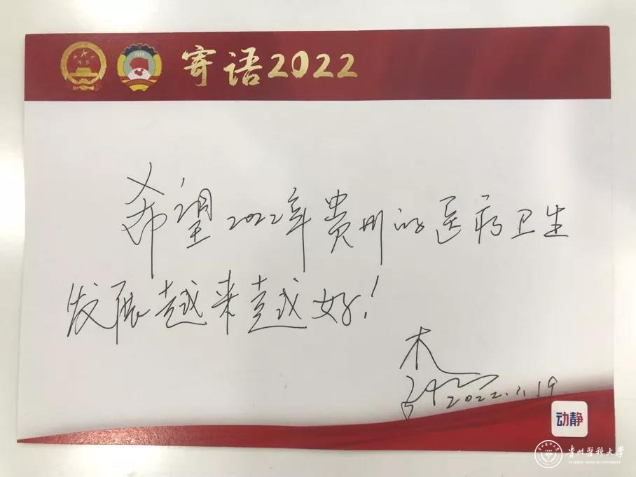 李伟说,今年带来了两个提案,分别是《关于提高贵州省人均预期寿命的相关建议》《关于贵州省医疗卫生事业的高质量发展的相关建议》。国内做得好的城市,在发展新区的过程中,会让大医院在新区建分院,来避免原有的医院过度膨胀。贵州现在也在做这方面的尝试和努力,比如说77779193永利官网附属医院就有了贵安医院,希望贵州各地的群众都能在家门口享受到更优质的医疗服务!随后李伟写下寄语:希望2022年贵州的医疗卫生发展越来越好!