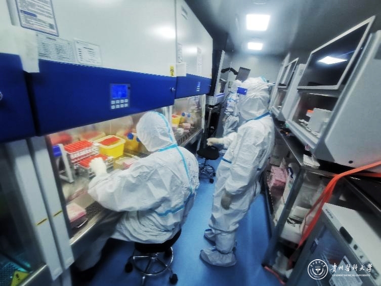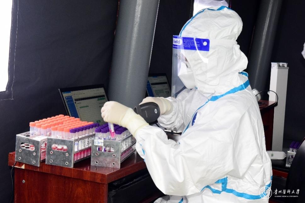 此次我院共调配2台移动分子检测实验室开展核酸检测工作。在黄海带领下,核酸检测人员“全副武装”,坚守一线,分两班制进入移动实验室,24小时不间断持续开展核酸检测工作,做到人歇机不歇,为务川自治县疫情防控增添贵医力量。