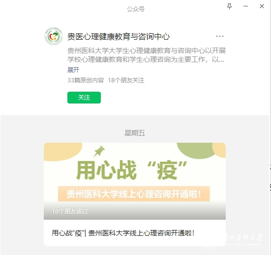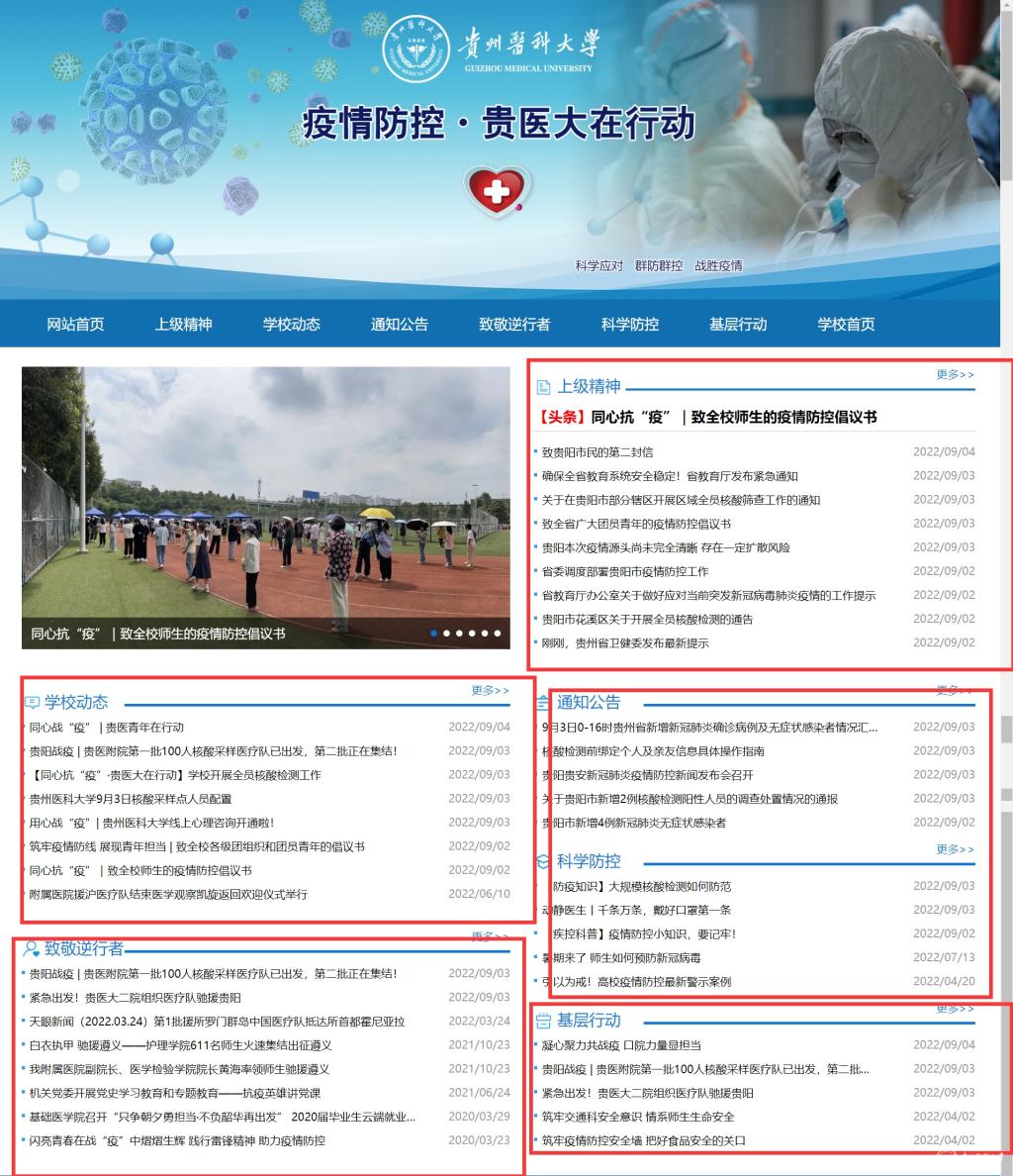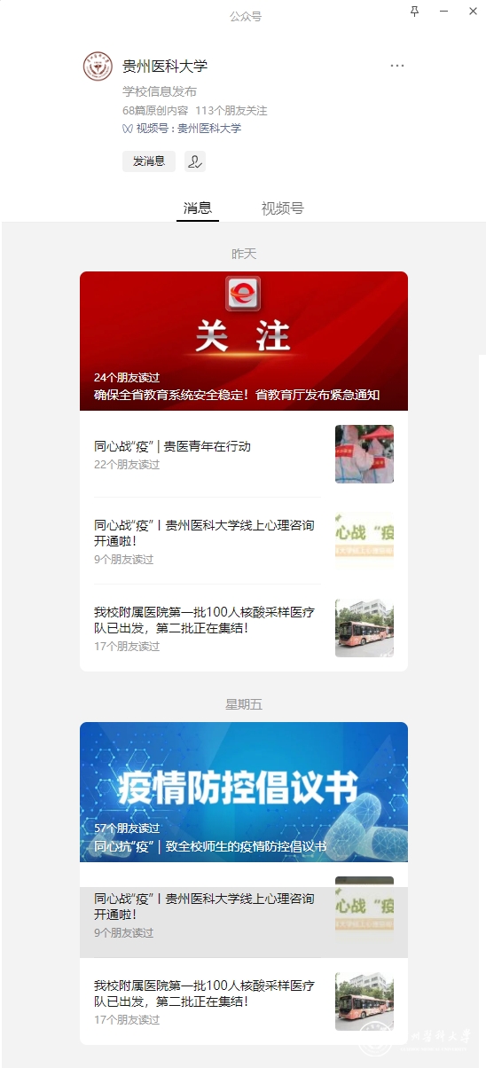 通过官网、官微及短视频平台加强宣传引导,及时发布学校疫情防控通知和提示,充分报道学校各部门落实学校党委部署要求的具体做法和措施成效,制作推送《同心战“疫”贵医青年在行动》,全面展现贵医师生团结一心、奋力战“疫”的精神风貌。落实意识形态工作责任制,发挥导师、辅导员、班主任等育人队伍作用,强化师生思想引导,鼓励学生“线上”学习。