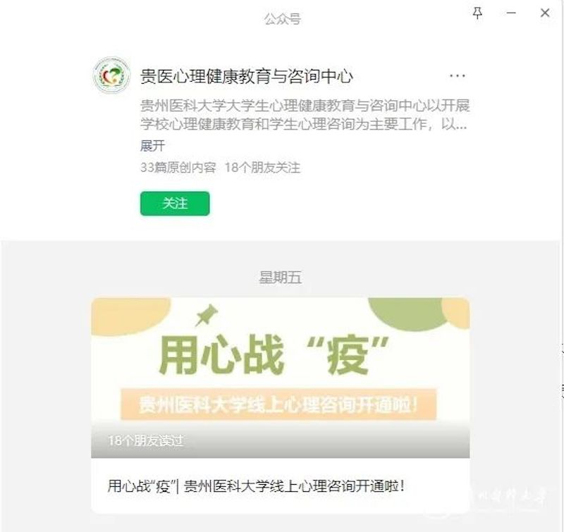 学校通过官网、官微及短视频平台加强宣传引导,及时发布学校疫情防控通知和提示,充分报道学校各部门落实学校党委部署要求的具体做法和措施成效,制作推送《同心战“疫”贵医青年在行动》,全面展现贵医师生团结一心、奋力战“疫”的精神风貌。落实意识形态工作责任制,发挥导师、辅导员、班主任等育人队伍作用,强化师生思想引导,鼓励学生“线上”学习。
