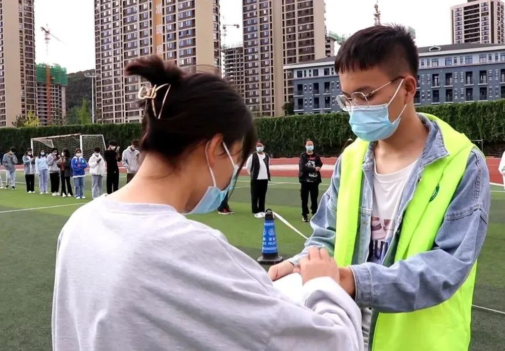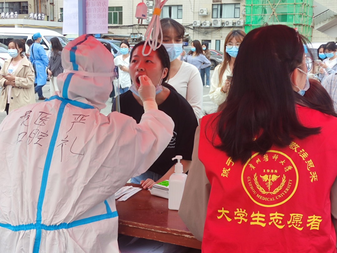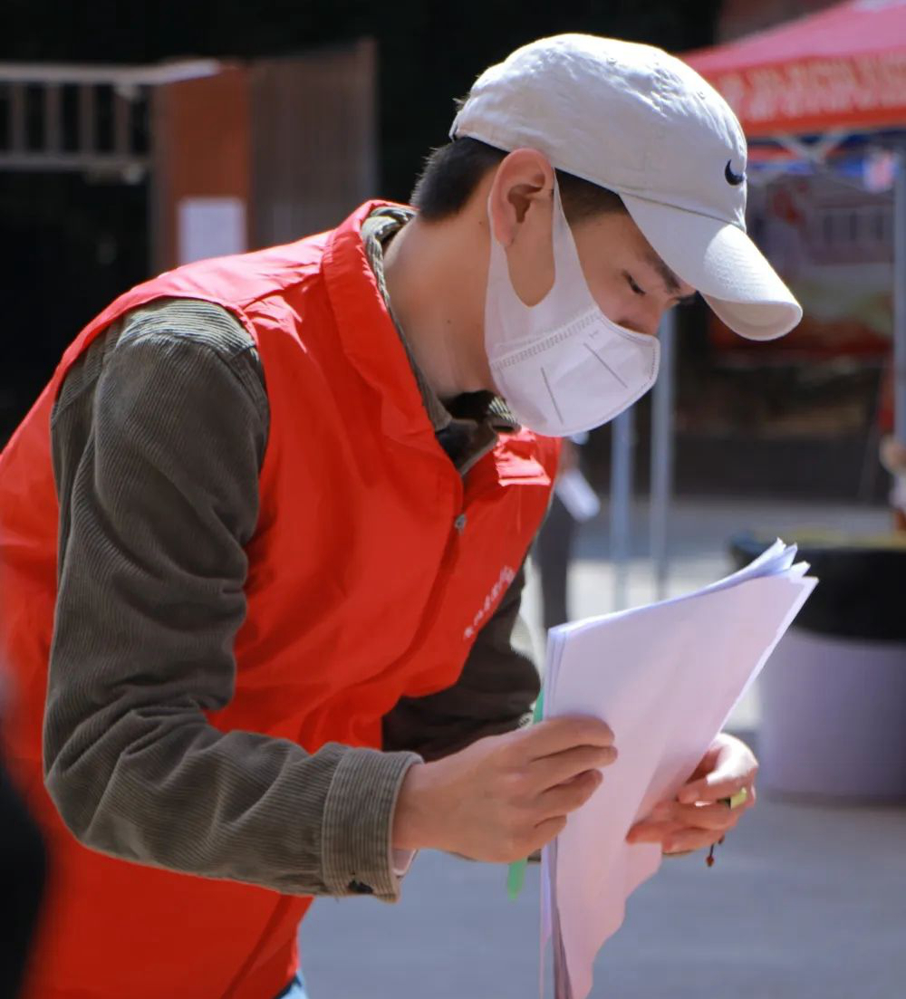 ▲贵阳学院:披上红马甲,戴上口罩……面对突如其来的疫情,他们奔忙学校各个角落,核酸采样点,变身 " 搬运工 "" 登记员 "" 巡逻员 ",用爱和汗水守护着校园的安全。