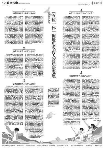 树立“大思政”工作理念。充分发挥党委在思想政治教育工作中的领导作用,树立“一个根本、两个定位、三全育人、四大工程、五共联促”的工作理念。“一个根本”即立德树人,“两个定位”即为党育人、为国育才,“三全育人”即全员育人、全程育人、全方位育人,“四大工程”即思政课程铸魂工程、课程思政浸润工程、中华优秀传统文化厚基工程、大学生志愿服务实践工程,“五共联促”即价值共生、工作共融、资源共享、声音共发、形象共树。不断创新思政育人格局,聚焦明理明道,聚焦入脑入心,聚焦落地落实,充分调动各类主体,“横向到边、纵向到底”,健全党委统一领导、党政工团齐抓共管、党委宣传部统筹协调、各部门和各学院共同参与的思政工作机制,健全学校家庭社会协同育人机制,形成上下互通、左右联动、整体合力、协同效应的思政大格局,把思想政治工作贯穿教育教学全过程,把思想政治教育贯穿人才培养全过程。
