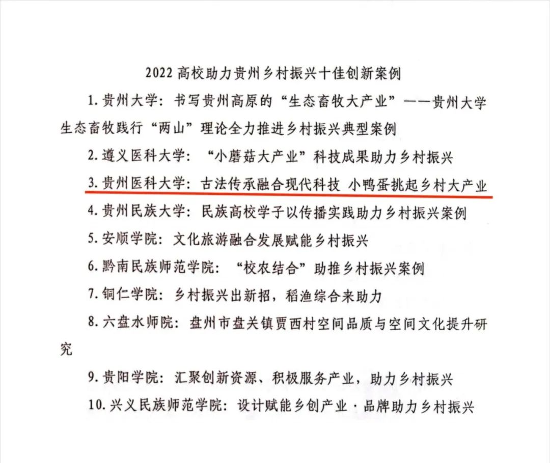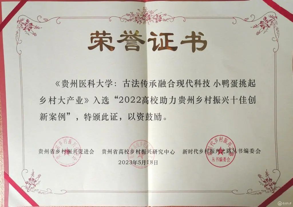 近日,贵州省高校乡村振兴2023年高端学术论坛在安顺学院召开,77779193永利官网助力乡村振兴案例《77779193永利官网:古法传承融合现代科技 小鸭蛋挑起乡村大产业》入选“2022高校助力乡村振兴十佳创新案例”,并获表彰。
