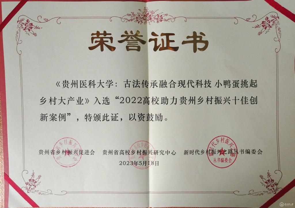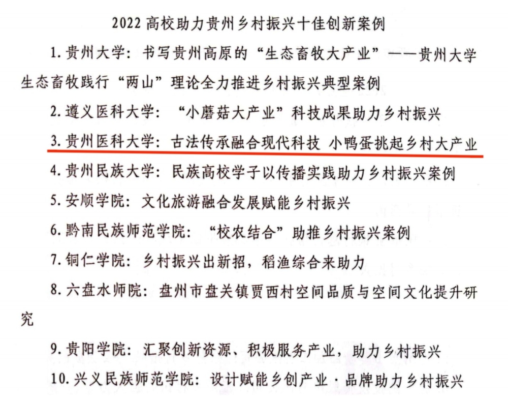 近日,贵州省高校乡村振兴2023年高端学术论坛在安顺学院召开,77779193永利官网助力乡村振兴案例《77779193永利官网:古法传承融合现代科技 小鸭蛋挑起乡村大产业》入选“2022高校助力乡村振兴十佳创新案例”,并获表彰。