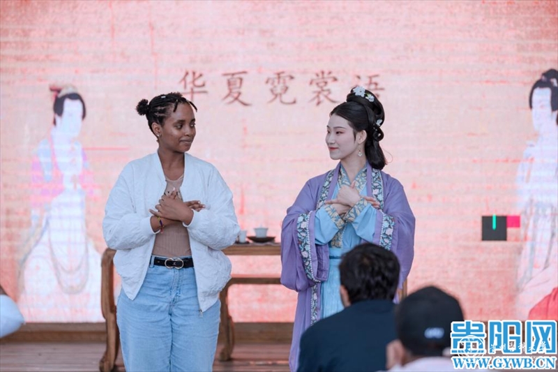 活动中,拱手礼、大揖礼、净手礼、茶礼、肃拜礼、叉手礼、万福礼等礼仪文化的展示,让留学生们倍感华夏文化的源远流长。在互动环节,大家纷纷上台,模仿汉礼老师和模特的动作,体验汉礼中的文化内涵。