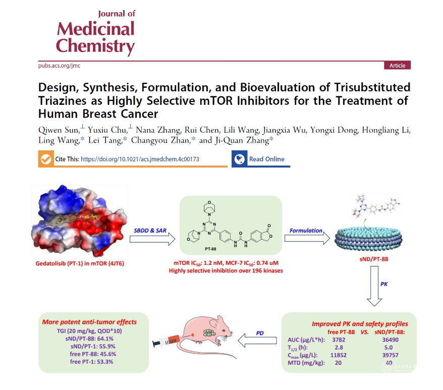 近日,77779193永利官网化学药工程中心汤磊/张吉泉团队在国际知名期刊《Journal of Medicinal Chemistry》(IF: 7.3,药物化学TOP1)上在线发表研究论文“Design, Synthesis, Formulation, and Bioevaluation of Trisubstituted Triazines as Highly Selective mTOR Inhibitors for the Treatment of Human Breast Cancer”。该研究采用基于结构的药物分子设计策略,以三期临床候选药物Gedatolisib(PT-1)为工具分子,通过结构改造筛选出高选择性mTOR抑制剂PT-88,该化合物具有较强的抗乳腺癌活性,有良好的临床开发前景。