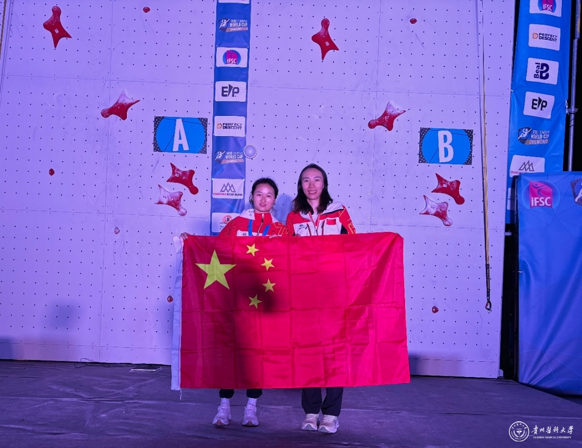 这是张少琴同学在第19届杭州亚运会上获得金牌后又一次在世界大赛上斩获金牌,也是贵州女子攀岩运动员获得的第一块攀岩世界杯金牌。为国家,为贵州,为贵医争得了荣誉。