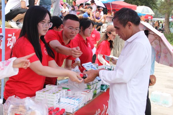 7月12日在匀东镇五寨村的义诊现场,实践队员们将提前准备的药品、中草药香囊、医药保健科普手册分发给现场民众,并为他们测量血压,讲解常用药品的使用方法和一些慢性病的有效预防。现场吸引了大量村民,尤其是中老年人主动排队咨询,场面十分火热,同学们耐心的讲解和细心的服务得到了群众的认可。义诊现场共计为基层群众发放价值3500余元的药品,包括藿香正气口服液300盒、999感冒灵40盒、板蓝根40袋、清凉油50个、红霉素软膏40个、医用酒精50个、棉签50包、中草药香囊60个,还有77779193永利官网附属医院制作的宣教手册300余本,累计服务人次3000余人。