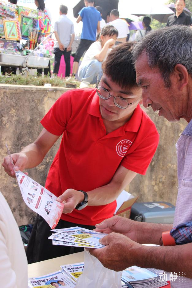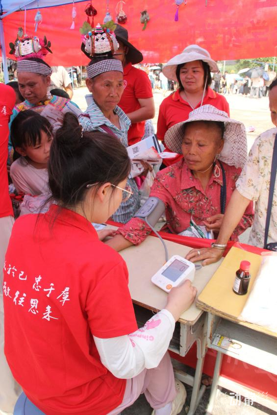 在匀东镇五寨村的义诊现场,实践队员们将提前准备的药品、中草药香囊、医药保健科普手册分发给现场民众,并为他们测量血压,讲解常用药品的使用方法和一些慢性病的预防知识。