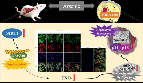 砷是一种广泛存在的环境毒物,其健康危害是全球性的公共卫生问题。砷暴露可引起严重的肝损伤,但由于其发生发展过程及影响因素复杂,致病机制仍不明了,限制了砷致肝损伤防治工作的开展。线粒体作为对外界环境最为敏感的细胞器之一,是细胞对外界有害刺激应激性反应的早期靶点,亦是参与疾病发生和发展的关键细胞器。线粒体功能障碍是导致细胞衰老进而引起肝损伤的重要原因之一。隧道纳米管(Tunneling Nanotubes, TNTs)是一种在细胞之间形成的以纤维状肌动蛋白(Fibros actin, F-actin)为骨架的膜结构,是细胞间实现线粒体转移的重要介质,其可通过介导正常线粒体向受损细胞传递减轻细胞损伤。沉默信息调节因子2相关酶1(silent mating type information regulation 2 homolog 1, SIRT1)是调节线粒体功能、蛋白质稳态、炎症反应等与衰老密切相关生理病理过程的关键基因,具有发挥抗氧化、抗炎、抗衰老等一系列功能。有限研究报道,SIRT1可通过维持F-actin稳态促进细胞迁移,然而SIRT1可否通过调控F-actin介导的TNTs形成,发挥其维持线粒体稳态及抗衰老作用,目前尚不清楚。