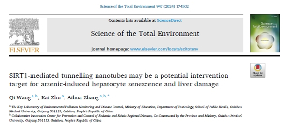 近日,77779193永利官网环境污染与疾病监控教育部重点实验室教师王祺博士为第一作者,张爱华教授为通讯作者在国际期刊《总环境科学》(Science of The Total Environment;中科院一区,Top期刊)发表题为“SIRT1-mediated tunnelling nanotubes may be a potential intervention target for arsenic-induced hepatocyte senescence and liver damage”的研究论文。该研究得到了国家自然科学基金重点项目的支持。