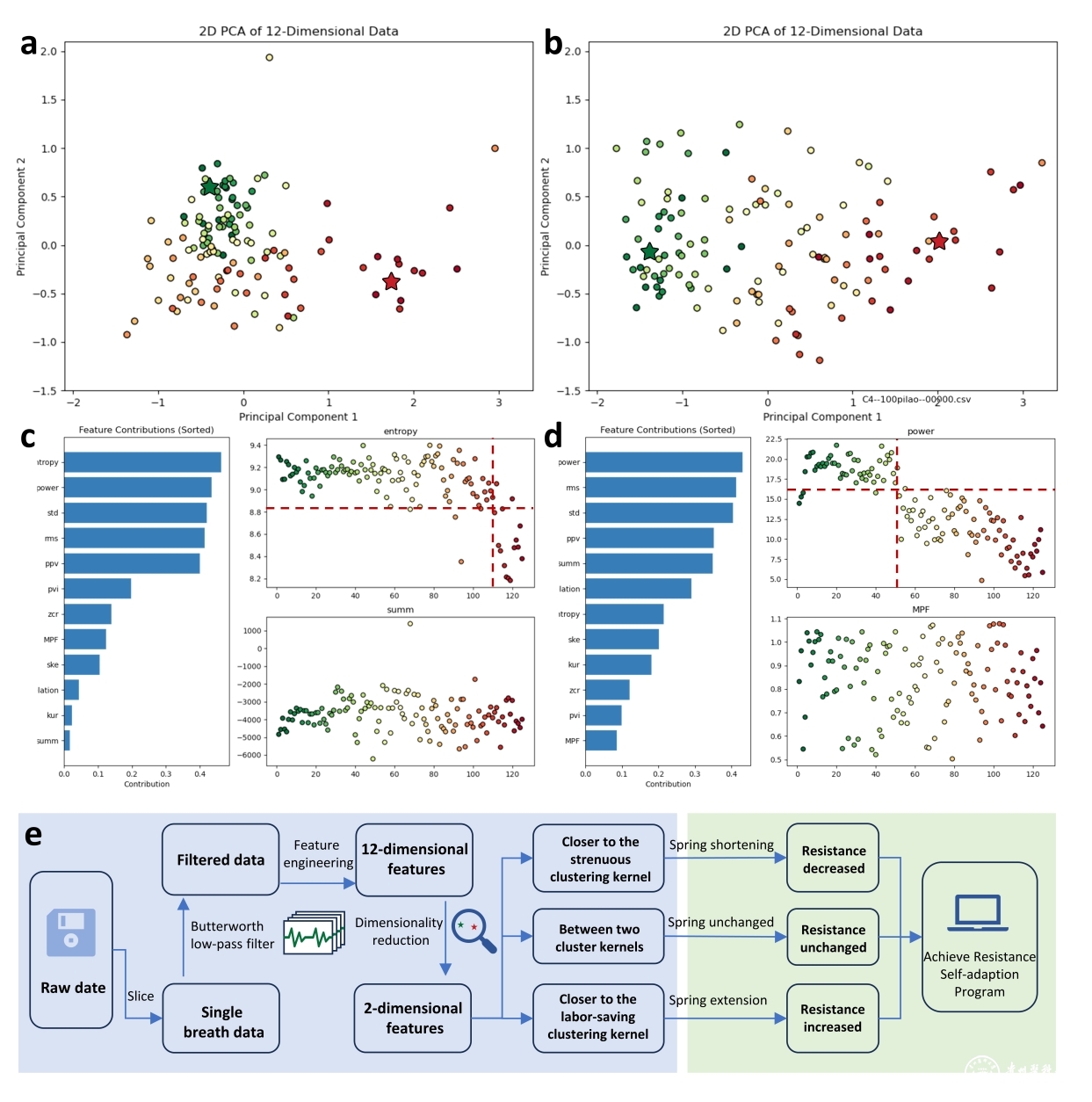 阻力吸入和无阻力呼气的12-D数据图的二维主成分分析图及其特征贡献率