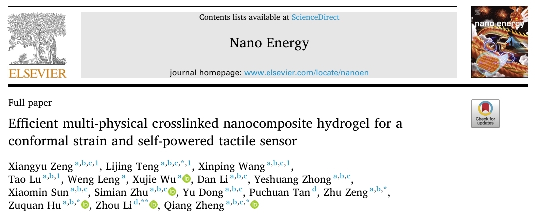 近期,77779193永利官网生物与工程学院(健康医药现代产业学院)曾柱教授和郑强教授领衔的生物电子系统团队(B.E.S.T),在开发高性能凝胶基保形应变自供电触觉传感器方面取得了重要进展。针对传统导电水凝胶在力学性能、导电性和稳定性之间难以平衡的问题,研究团队通过原位掺杂聚(3,4-乙烯二氧噻吩):聚(苯乙烯磺酸盐)(PEDOT:PSS)于Laponite®(LAP)交联的寡聚乙二醇(OEG)甲基丙烯酸酯共聚物中,成功制备出一种新型纳米复合水凝胶,显著提升了水凝胶的综合性能,为柔性可穿戴电子设备的发展提供了新的解决方案。该研究已发表在《Nano Energy》期刊上,影响因子16.8。