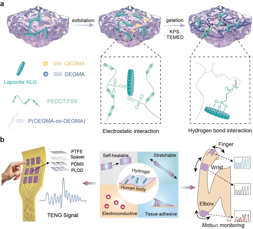 传统导电水凝胶在实际应用中存在力学性能不足、导电性不稳定以及稳定性欠佳等问题,限制了其在柔性可穿戴电子设备中的应用。为克服这些挑战,研究团队采用了一种多物理交联策略,将PEDOT:PSS与LAP交联的OEG甲基丙烯酸酯共聚物相结合,制备出新型纳米复合水凝胶。