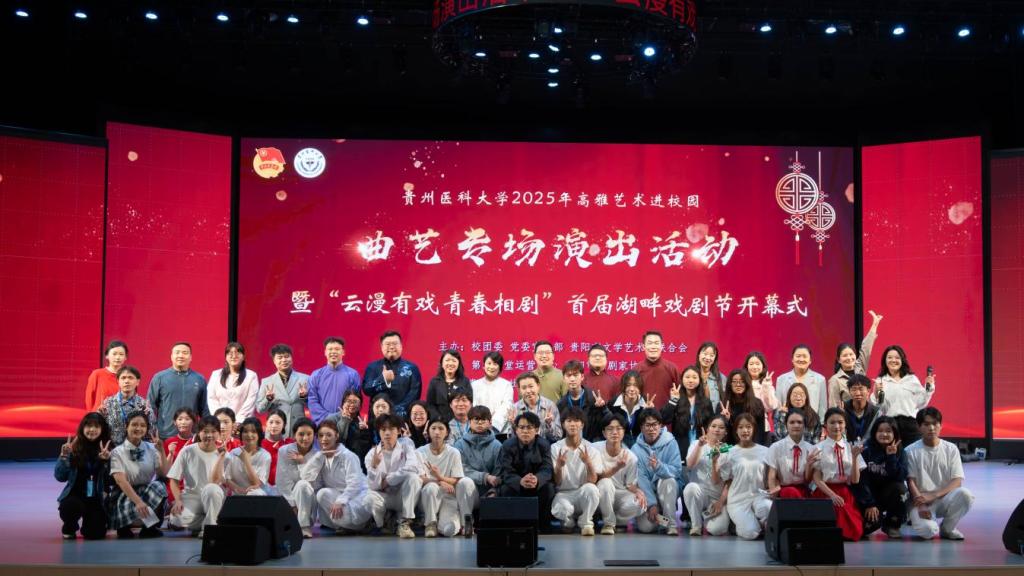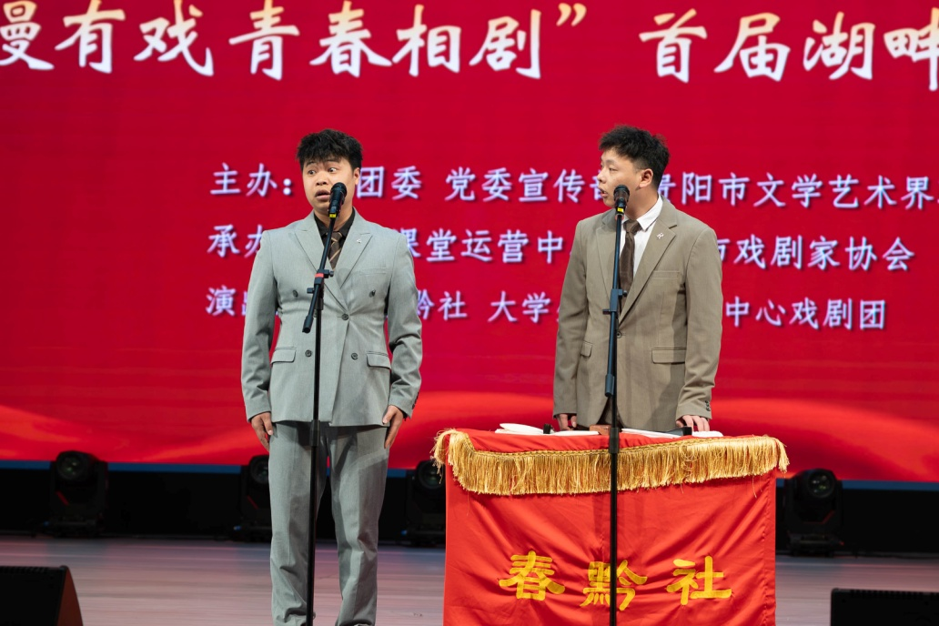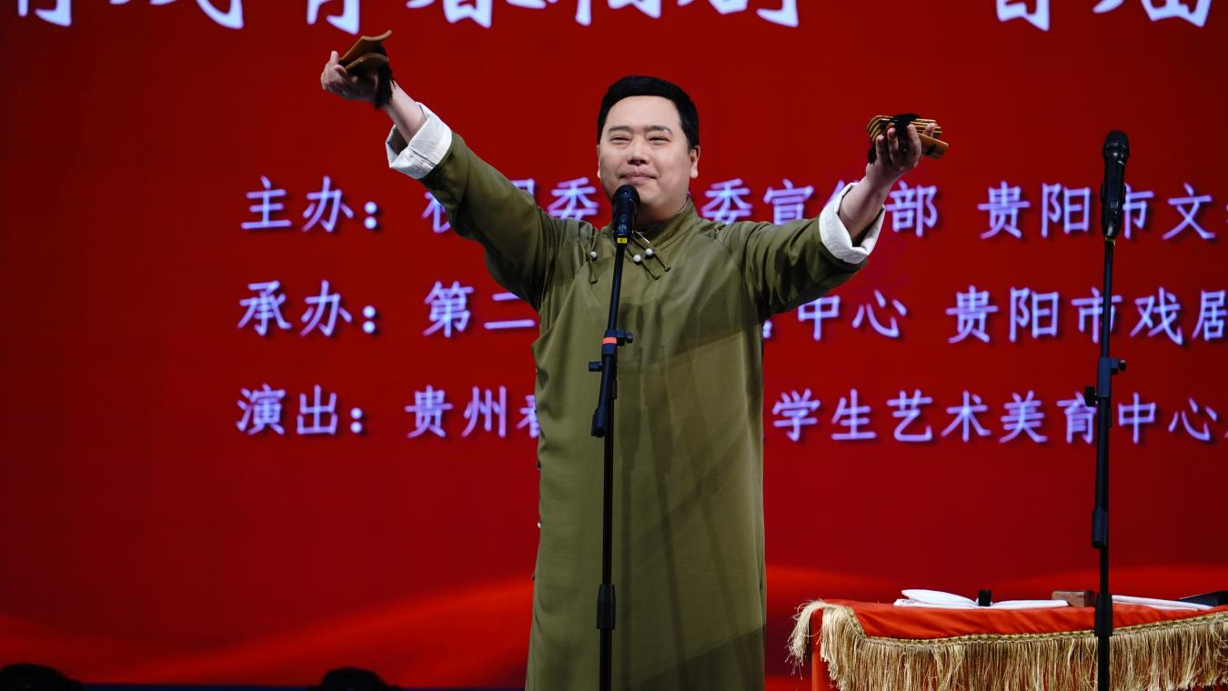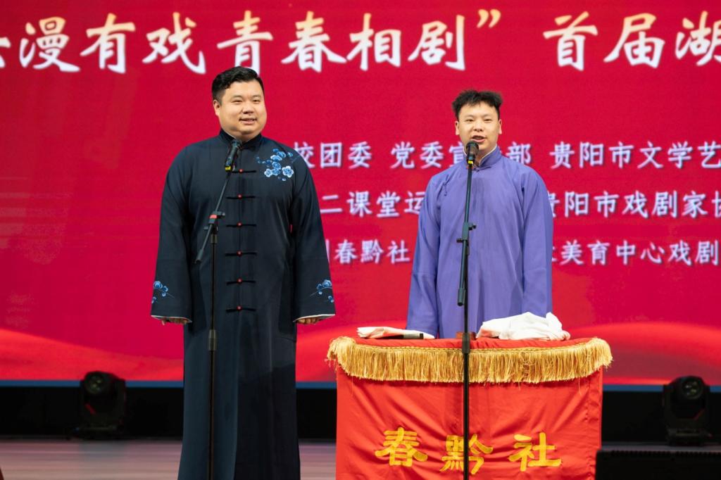 随后,春黔相声社带来了快板《花灯礼赞》与相声《多彩贵州》《礼仪漫谈》《自驾奇遇》等节目,将贵州文化与校园生活融入曲艺,形式生动活泼,赢得全场掌声不断。贵阳市剧协副主席、春黔社演员刘振峰表示,用大学生喜闻乐见的形式传播传统文化是他们的初心。