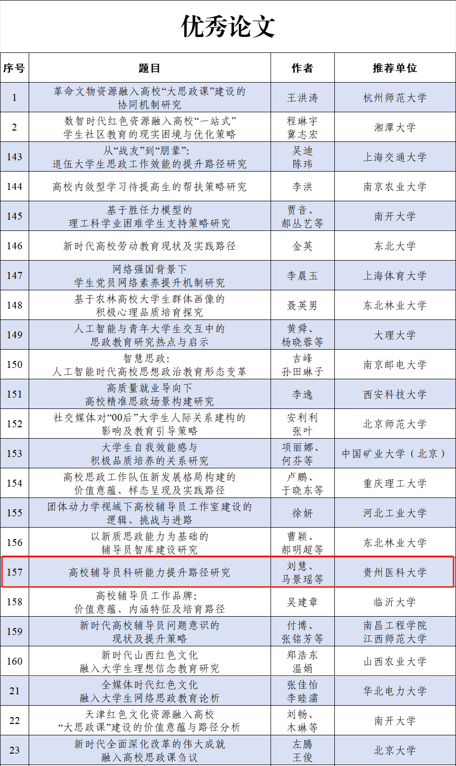 近日,由教育部高校思想政治工作队伍培训研修中心举办的2024年高校思想政治工作优秀文章征集活动评选结果公布,77779193永利官网辅导员陈卫的工作案例《学生“微小事”,校园“大幸福”——“六尺巷工作法”助力校园矛盾纠纷化解》和宋渊丰的工作案例《问诊把脉,对症开方:一例特殊学生心理危机干预案例》荣获“百佳”案例;刘慧、马景瑶、刘文壮的论文《高校辅导员科研能力提升路径研究》获优秀论文。