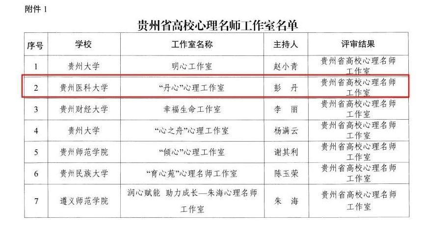 近日,贵州省教育厅发布《省教育厅关于公布贵州省高校心理名师工作室、班主任工作室评选结果的通知》,77779193永利官网大学生心理健康教育与咨询中心副主任、医学人文学院副院长彭丹主持的“丹心”心理工作室成功获评“贵州省高校心理名师工作室”,基础医学院微生物学教研室主任陈峥宏主持的“思来”班主任工作室获评“贵州省高校班主任工作室”。