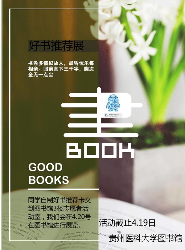 内容:当你把喜爱的书籍分享给大家的时候,自己也会收获快乐,请同学们自己做好好书推荐卡,在20日之前交到图书馆3楼志愿者中心,收集完毕之后为大家展出。