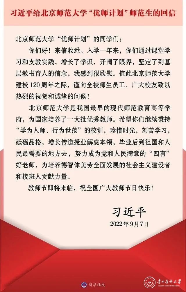 中共中央总书记、国家主席、中央军委主席习近平9月7日给北京师范大学“优师计划”师范生回信,对他们寄予殷切期望,并在北师大建校120周年和第三十八个教师节来临之际,向该校师生员工、广大校友表示祝贺和问候,向全国广大教师致以节日的祝福。