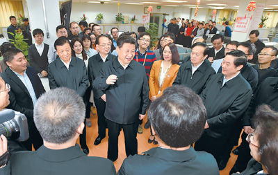 二月十九日,中共中央总书记、国家主席、中央军委主席习近平在北京主持召开党的新闻舆论工作座谈会,并到中央新闻单位调研。这是习近平在人民日报社总编室同编辑们亲切交流。 新华社记者 李 涛摄 |