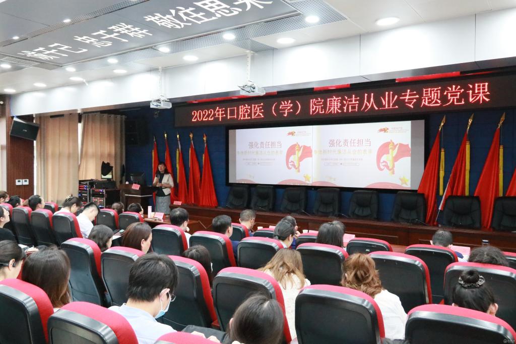 6月8日,口腔医(学)院党委书记张军梅在北校区行政楼五楼学术报告厅作2022年廉洁从业专题党课。院党政班子成员及党委委员出席,全院副科级以上干部、全体党员、各民主党派代表、党员学生代表参加。会议由纪委书记郑慧颖主持。