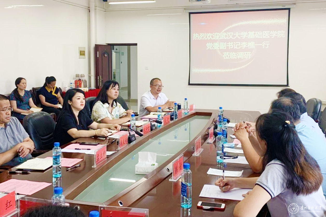 7月11日,武汉大学基础医学院党委副书记李樵、微生物学教研室副主任冯勇等到永利官网基础医学院调研。基础医学院党政负责人、微生物学教研室、教学科研管理科、综合办公室、研究生科、学生科、分团委负责人、辅导员代表参会。