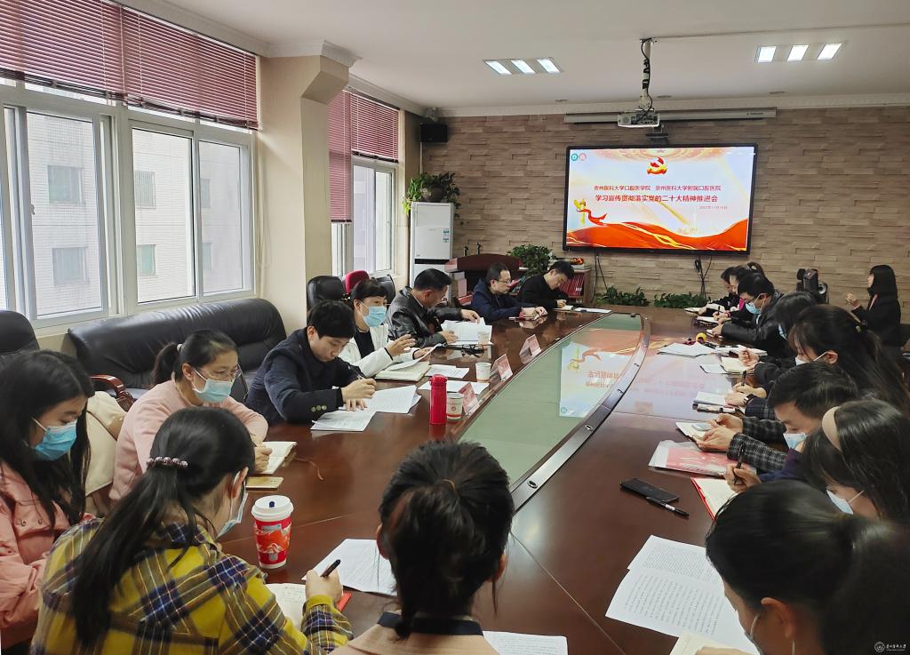11月15日,口腔医(学)院在行政楼五楼会议室召开了学习宣传贯彻落实党的二十大精神推进会,会议由院党委书记张军梅主持。院长马洪,纪委书记郑慧颖,保密、统战委员董强,青年委员刘洪静出席会议,党群工团各部门主要负责人及各党支部书记参加会议。