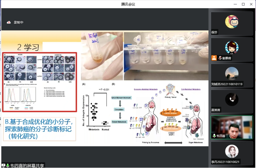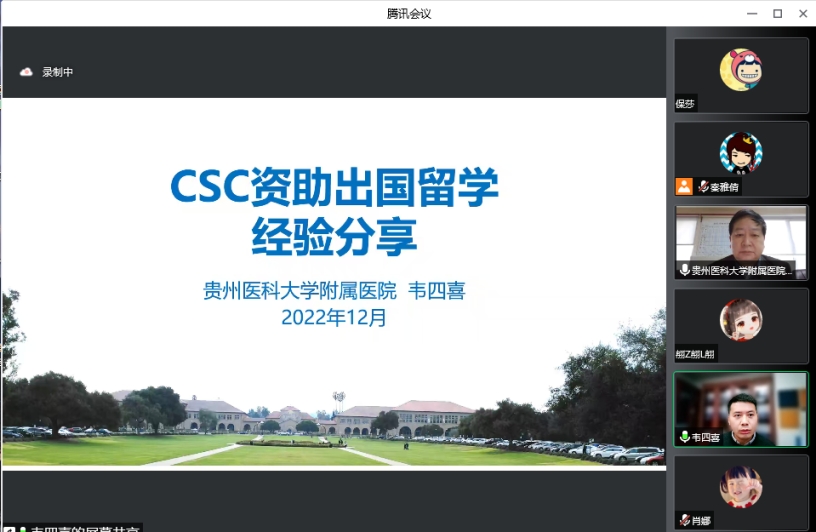 韦四喜以“CSC资助出国留学经验分享”为题,分享了自己在国外的学习、生活及安全等方面情况。韦四喜从填写留基委项目的申请表开始,详细讲述行前准备,包括行前与导师联系、拟定科研计划的过程,再到出行所需文件资料、生活用品、常备药品的准备等一一进行了讲解说明;留学期间生活方面,从在异国他乡的购物出行、驾驶技能、饮食健康、运动锻炼等方面给出建议,要了解外国人的思维与行为方式,互相帮助,积极交友,建立更好的人际关系,注重礼貌礼仪,参加聚会活动要注意形象、自信大方,尊重了解异国信仰、文化和习俗,并以具体事例告诫出国留学人员要把生活中遇到的挫败感视为人生的考验,及时调整状态保证留学期间的身心健康。学习方面,讲述了在美国加州大学戴维斯分校从事科研项目基于小分子药物探索TKI的耐药机制、基于合成优化的小分子探索肺癌的分子诊断标记(转化研究)、肺癌的免疫治疗PDX模型/免疫标记等主要工作的开展情况。讲座内容干货满满,对于准备出国人员是一次接地气、实操性较强的学习指导。