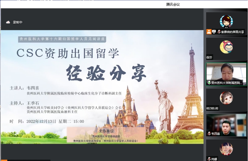 12月13日,永利官网欧美同学会(校留学人员联谊会)第十六期“踏留学之路•筑强国之梦”归国留学人员见闻讲座通过腾讯会议在线上举行。讲座由党委统战部及校欧美同学会(校留学人员联谊会)主办,归国留学人员、77779193永利官网附属医院临床检验中心临床生化分子诊断科副主任韦四喜为主讲嘉宾,校欧美同学会(校留学人员联谊会)会长、附属医院血液科主任王季石主持讲座。