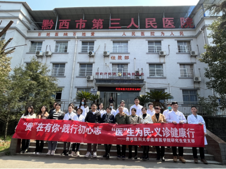 2月27日,临床医学院教工党支部、研究生党支部携手贵州省励志公益发展中心赴黔西市第三人民医院(钟山卫生院)开展“建设多彩贵州现代化 坚持‘三位一体’促发展”党支部主题党日活动和“贵在有你·践行初心志医生为民·义诊健康行”志愿服务活动。黔西市政协党组书记、主席余刚跃,临床医学院党委副书记王筑山带队,贵州省励志公益发展中心、黔西市政协、黔西市第三人民医院有关领导参加活动。