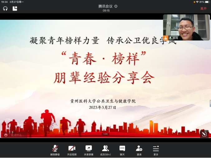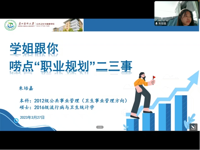 3月27日,公共卫生与健康学院组织开展“青春▪榜样”朋辈经验分享会第一期:求学之路。邀请2019届流行病与卫生统计学专业优秀硕士毕业生朱培嘉(现就读于厦门大学流行病与卫生统计学专业博士研究生)进行线上经验分享。学院党委书记郑维薇、副书记何江、辅导员以及28个行政班级约2000余人通过线上线下结合的方式收看。