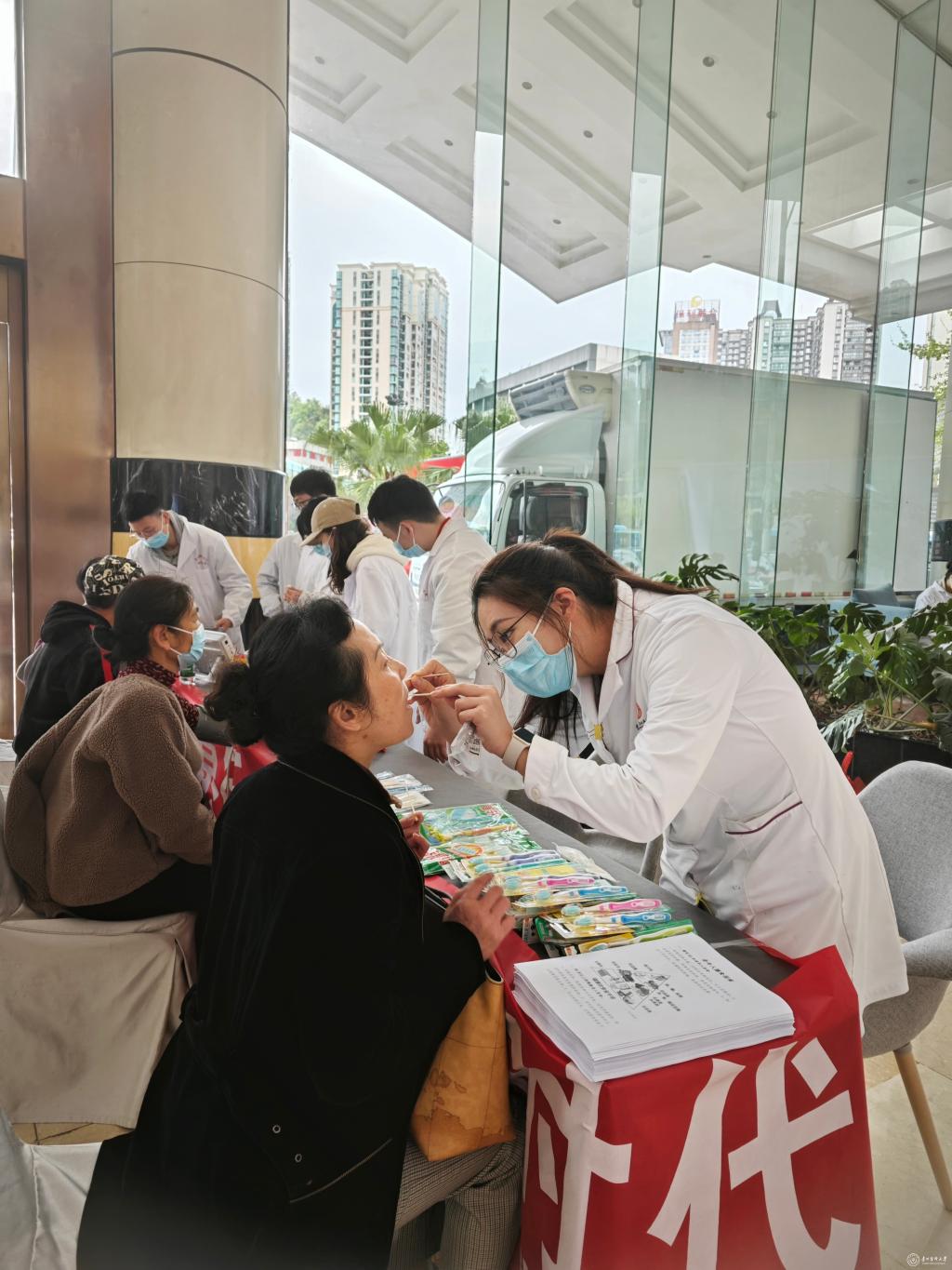 活动现场,义诊团队为老年群体进行口腔义诊、测量血压、分发老年人膳食指南宣传册,耐心解答他们的疑问。并深入医院养老中心,为长期卧床的老人检查口腔,提供专业的口腔保健建议。