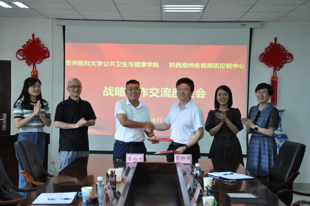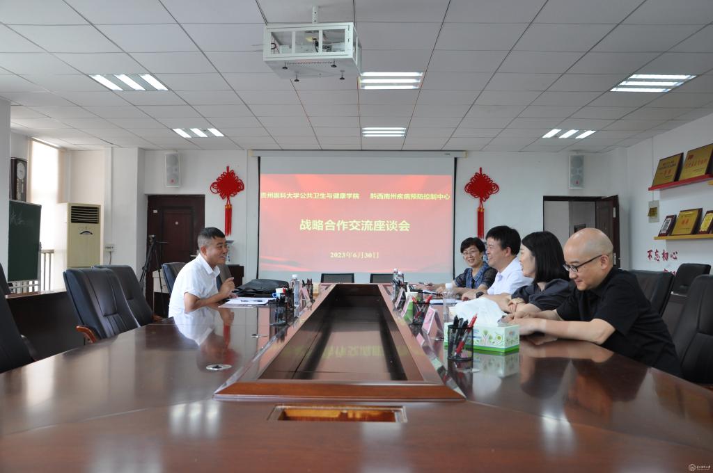 6月30日,永利官网公共卫生与健康学院与黔西南州疾病预防控制中心开展合作交流座谈会暨战略合作协议签订仪式在77779193永利官网南校区博雅楼二楼会议室举行。黔西南州疾病预防控制中心副主任吴营兴、学院党委书记郑维薇、院长洪峰、副书记何江、副院长李军、正科级组织员王胜利参加座谈会。