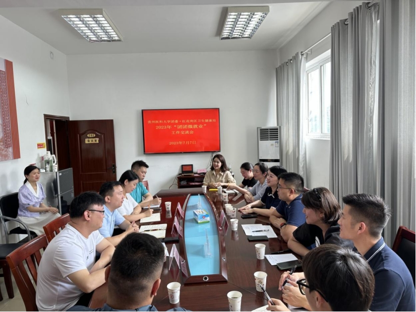 在遵义市红花岗区卫生健康局,卫生健康局党委委员、卫生事业服务中心主任卢小飞,介绍红花岗区医疗布局和各类别机构发展情况,他希望双方可以在人才培养、校地融合等方面展开密切合作。王妤煜对红花岗区卫生健康局给予学校今年暑假“三下乡”社会实践活动的大力支持表示感谢,希望双方继续加强在就业创业,实训基地等方面的交流合作。与会人员围绕“团团微就业”、大学生暑期“三下乡”社会实践、社区结对帮扶等工作展开深入探讨和交流。