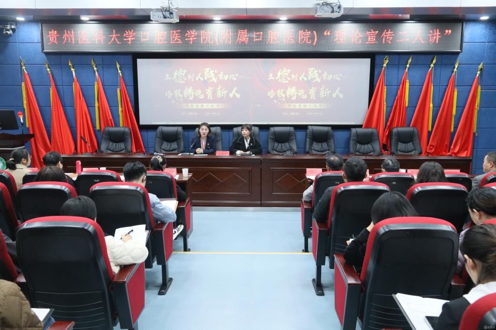 学院党委副书记何雨羲与口腔医学院本科生第一党支部书记赵会以“立德树人践初心,培根铸魂育新人”为题作宣讲,主讲人通过学习党的二十大精神引入高校教育的初心和使命,同时结合党的二十大精神实质,以典型的案例分析人才培养的具体举措和创新方法。