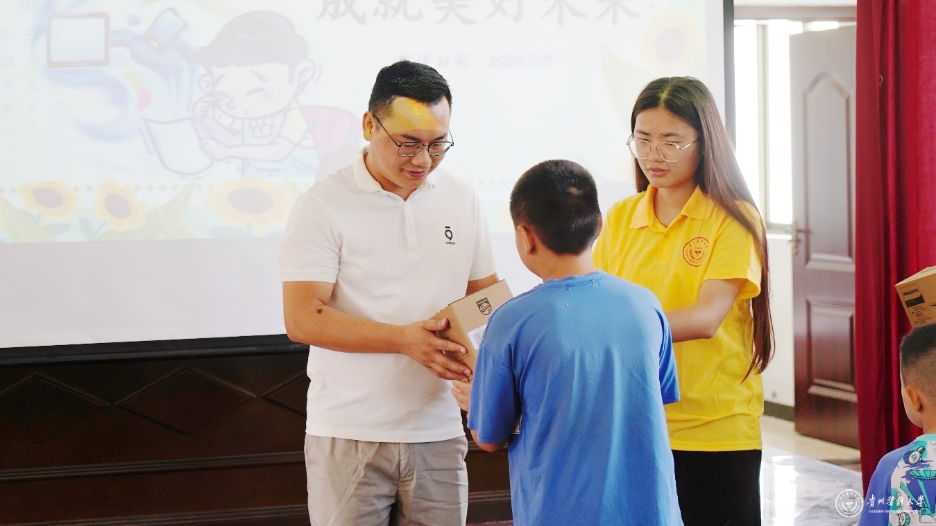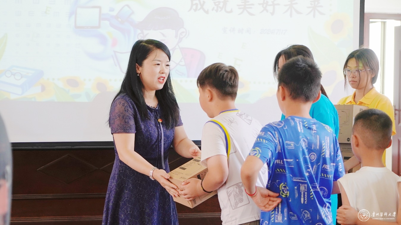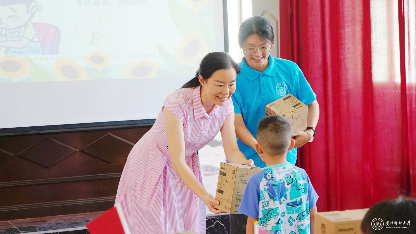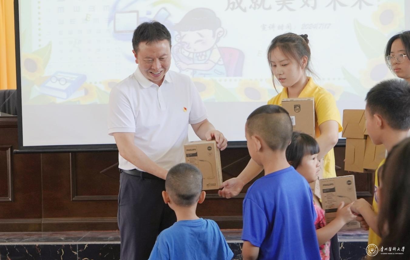 汤磊一行看望了在三穗县开展社会实践的基础医学院、医学人文学院实践队,并为当地留守儿童赠送护眼台灯。