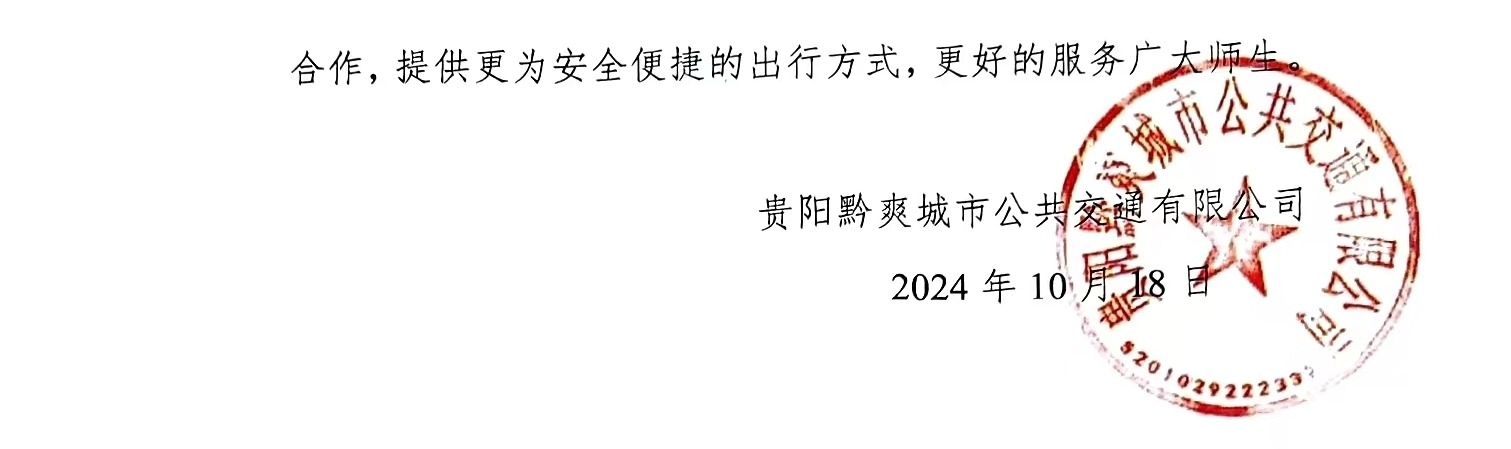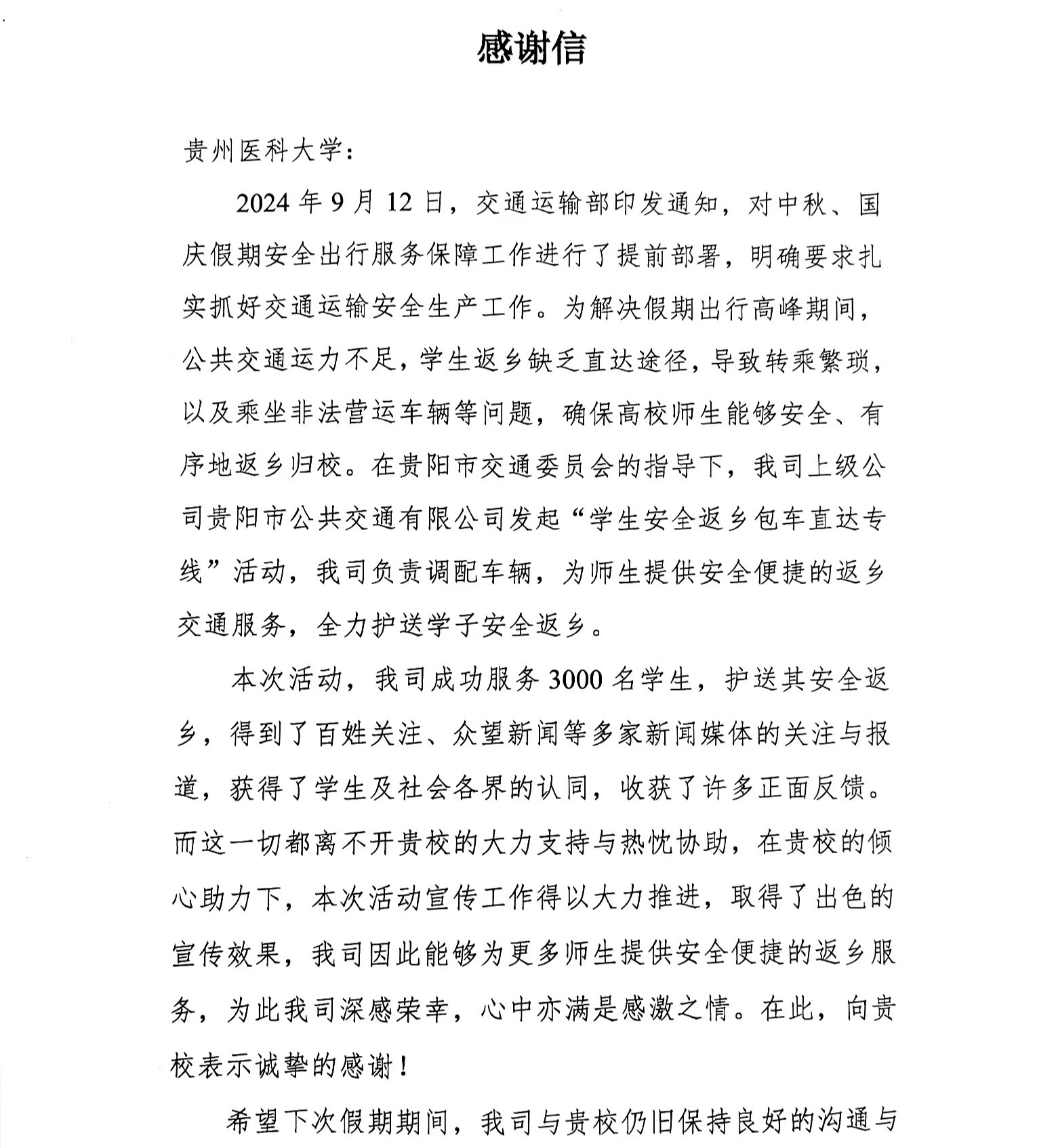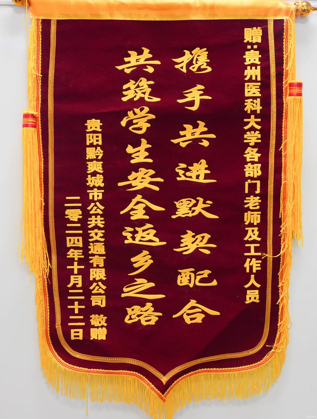 10月24日,永利官网收到来自贵阳黔爽城市公共交通有限公司感谢信和锦旗,感谢永利官网在中秋、国庆假期对“学生安全返乡包车直达专线”活动的大力支持和热忱协助,为全力护航学子平安便捷出行、运输畅通有序提供有力安全保障。