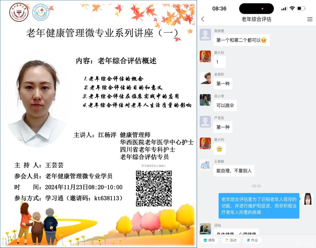 11月6日,老年健康管理微专业正式开课,课程内容涵盖了《老年辅具使用》《养老院的经验与管理》《老年综合评估》等实用科目,授课团队主要由护理学院专职教师、南明区晚霞彩带老年人日间照料中心的资深团队成员、附属医院老年医学科医护人员以及四川大学华西医院老年医学中心护士组成。