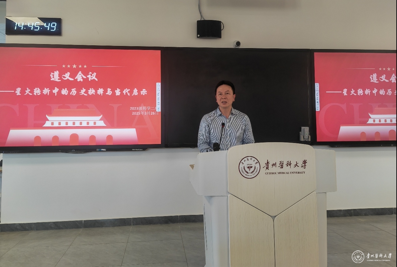 3月26日,药学院2023级药学2班在致知楼L201教室开展“铭记历史,传承使命——纪念遵义会议召开90周年”主题班会。校党委副书记汤磊出席,药学院党委书记高秀丽、药学院党委副书记包欢欢、药学院团委书记徐冉及2023级药学2班全体同学参加,班会由辅导员龚垚主持。