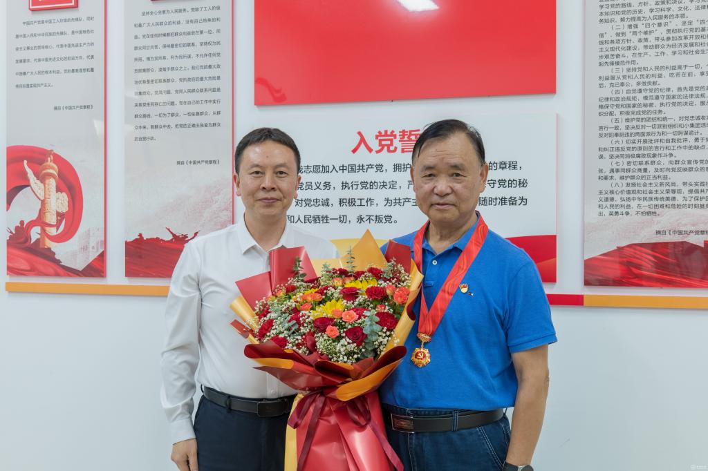 汤磊与老党员毕志忠同志亲切交谈,真诚感谢他为学校建设发展作出的积极贡献,随后为其颁发“光荣在党50年”纪念章,并送上祝福花束,同时希望老同志继续关心支持学校发展,积极建言献策。勉励年轻干部要以获纪念章老党员为榜样,传承老党员无私奉献的精神,在管理服务实践中主动担当作为,做到“让党满意,让老同志放心”。