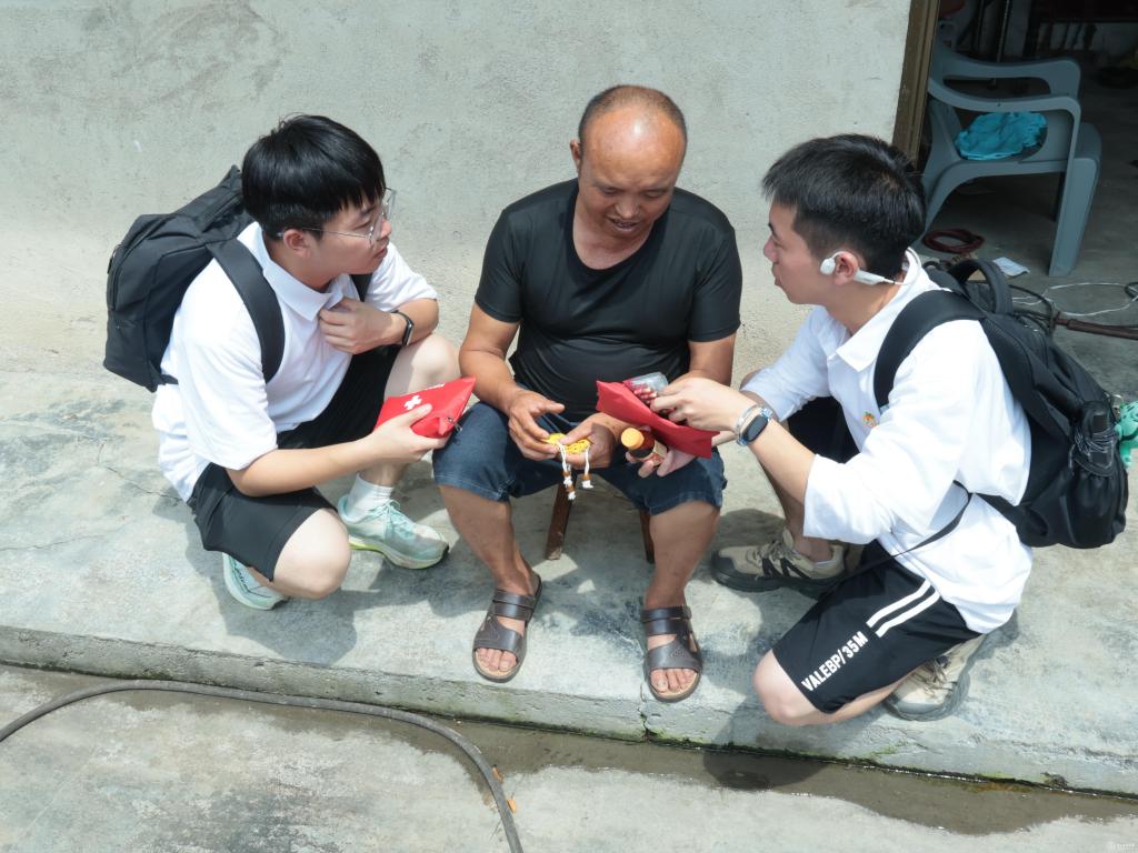 实践队深入蜜蜂村开展“情暖夕阳”关爱行动,通过入户走访的形式与老人们亲切交流。队员们耐心询问老人们的日常生活、健康状况以及实际困难。走访过程中,针对腿脚不便老人、“小病硬扛”的困境,为老人们送上基础感冒药物等,并耐心讲解用药知识;实践队员们将所学知识转化成服务乡亲的实际行动,通过中药配伍的原则,将艾草、冰片、小茴香等中药材制作的香囊赠予村民,守护夏夜安眠,用真诚的陪伴传递温暖,让老人们感受到社会的关怀与重视。