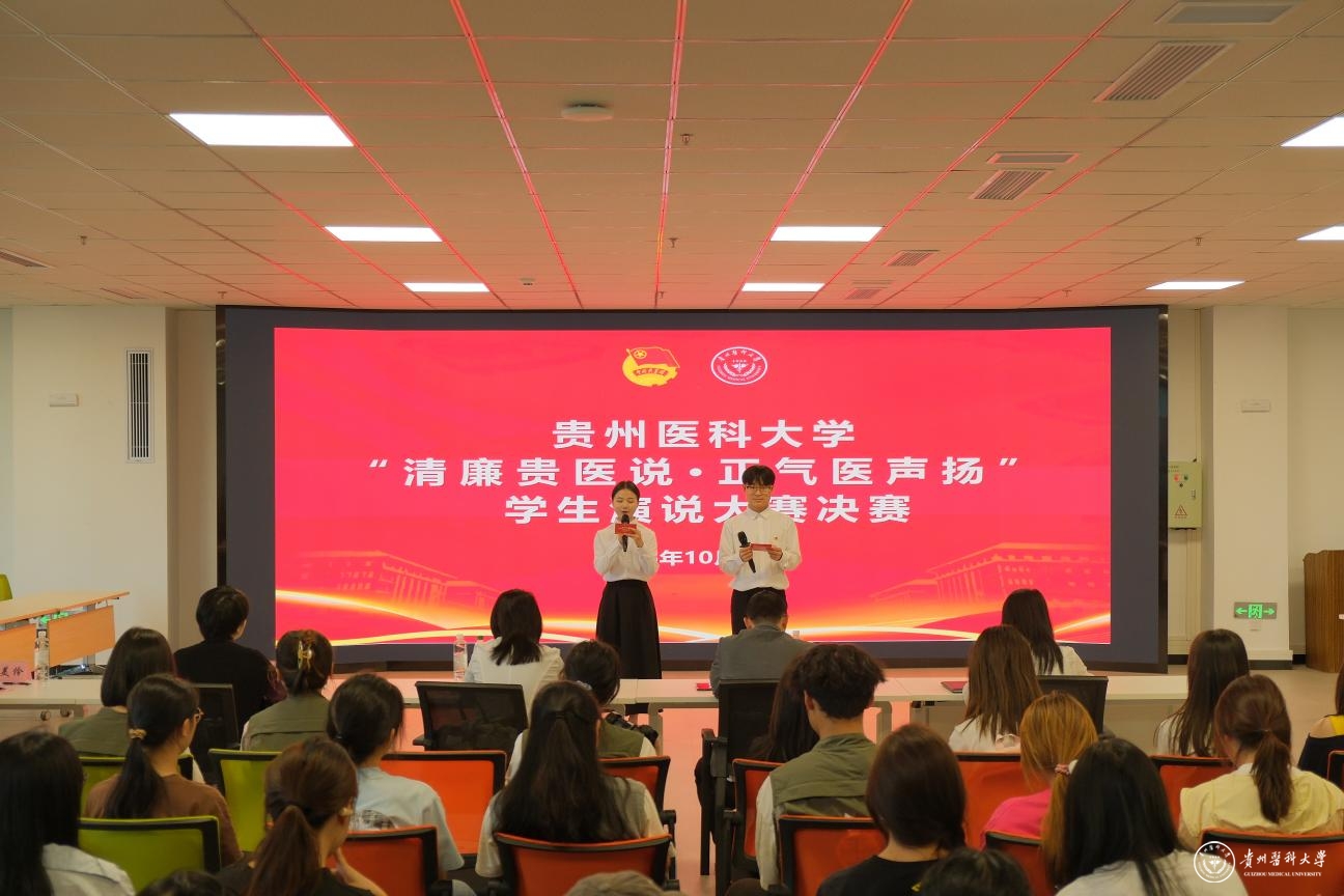 校团委书记王妤煜、机关党委副书记王筑山、机关纪委书记马龙、学生社区管理办主任刘美伶、党委组织部(党校)组织科副科长田萍担任比赛评委。各学院团委负责人、学生代表200余人到场观赛。决赛由青马宣讲团成员沈璐、李阳鑫主持。大赛自启动以来,得到全校学生的广泛关注和积极参与。经过自主报名、学院初赛和学校复赛的层层选拔,最终12名优秀选手脱颖而出,晋级决赛。决赛评分标准涵盖演说内容、语言表达、形象风度及综合印象四个维度。决赛现场,选手们紧扣廉洁主题,呈现了《清廉行医,正气立世》《白袍承志,清廉逐光》《青年拒腐守廉,医者笃行初心》等富有感染力的演说。他们结合医学专业特色与新时代青年使命,或引经据典阐释廉洁文化的历史传承,或立足专业剖析医者廉洁从业的时代价值,或真情讲述对“大医精诚”精神的深刻感悟。选手们以饱满的激情、真挚的语言和自信的风采,生动诠释了对廉洁行医、清白做人的深刻理解,充分展现了贵医学子崇廉尚洁的价值追求和昂扬向上的精神风貌。整场比赛高潮迭起,或慷慨激昂,或深情诉说,为现场观众带来了一场深刻的思想洗礼,赢得了阵阵热烈掌声。