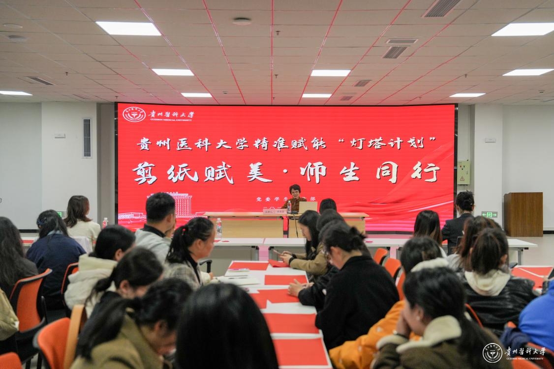 10月31日,为全面提升永利官网辅导员的美育素养与育人能力,进一步推动“五育融合”落地落实,永利官网举办辅导员精准赋能“灯塔计划”之“剪纸赋美·师生同行”专题培训。本次活动特邀中国民间文艺家协会会员、中国工艺美术协会会员、贵州省民间文艺家协会理事、贵州省剪纸研究会副会长兼秘书长许瑞芬老师担任主讲。党委学生工作部相关人员、各学院分管学生工作副书记代表,各学院辅导员及2024级协和班学生代表共同参与。