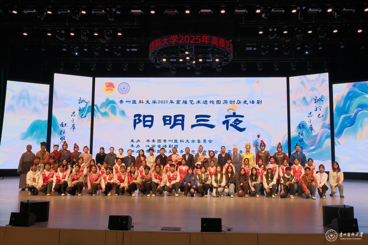 这不仅是一场艺术演出,更是一堂生动的“美育思政课”。 王阳明“知行合一”“致良知”“心学”的思想,与医学教育中强调的“理论与实践相结合”、医者“精诚合一”的职业精神高度契合。活动现场气氛热烈,掌声不断。演出在贵医青年中引发强烈共鸣,一位同学在观后激动地表示:“现场观看给人一种立体的震撼。当王阳明说出‘此心光明’时,我深受触动。这让我对‘致良知’和‘知行合一’有了更深刻的理解,也启示我未来在从医道路上,要始终坚守良知,将所学所知付诸实践。”