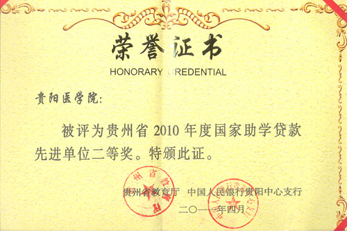 永利官网被贵州省教育厅、中国人民银行贵阳中心支行评为贵州省2010年度国家助学贷款先进单位二等奖。