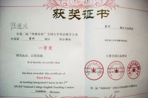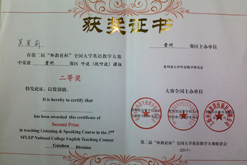 “第二届‘外教社’杯全国大学英语教师讲课比赛贵州赛区”总决赛于5月29日在贵州大学落下帷幕。这是贵州省高校首次参赛,历时两日,分复赛和决赛两轮。我省20所高校经过各自初赛选拔后推出的38名教师分别参加“综合组”和“视听说组”的角逐。经过讲课和说课环节的比赛,永利官网大学外语教学部大学英语教研室选派的两位选手都取得优异成绩,其中陈德凤老师获得“综合组”一等奖,吴军莉老师获得“视听说组”二等奖。