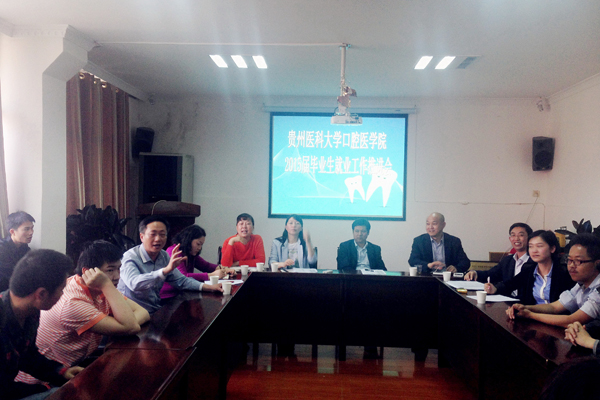 4月30日,口腔医学院2015年毕业生就业工作推进会在老药学楼5楼会议室召开。口腔医学院党委高度重视,特别邀请了贵阳市口腔医院门诊部主任张磊、贵州省民营口腔医学会会长李卫斌为同学作行业发展讲座,并邀请了校招就办主任张红霞、副主任刘雪梅指导就业工作。口腔医学院党委书记张军梅、党委副书记唐正龙、副院长王永、学生科科长兼10级辅导员钱禾、以及10级全体同学参会,会议由钱禾老师主持。
