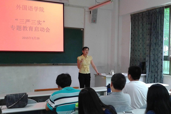 按照《关于印发<关于在处级以上领导干部中开展“三严三实”专题教育的实施方案>的通知》(贵医党通〔2015〕24号)要求,5月29日上午九点,外国语学院在北校区召开了“三严三实”专题教育启动会,会议由外国语学院党委书记张婷婷主主持。